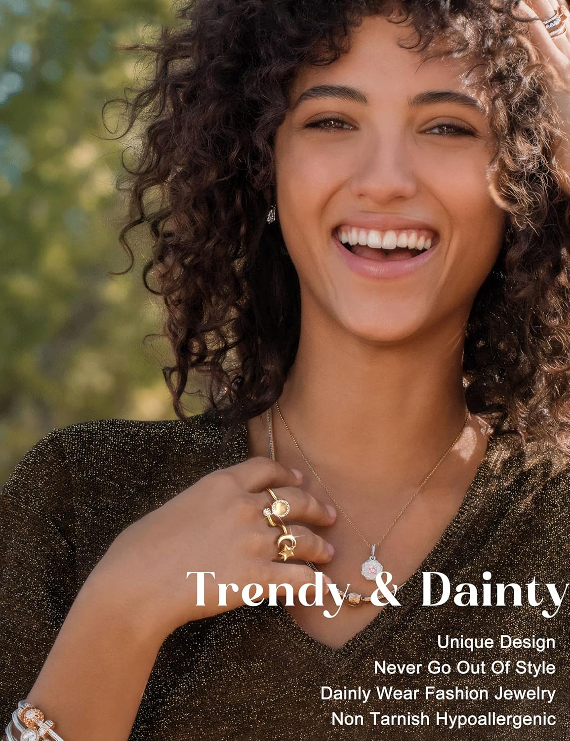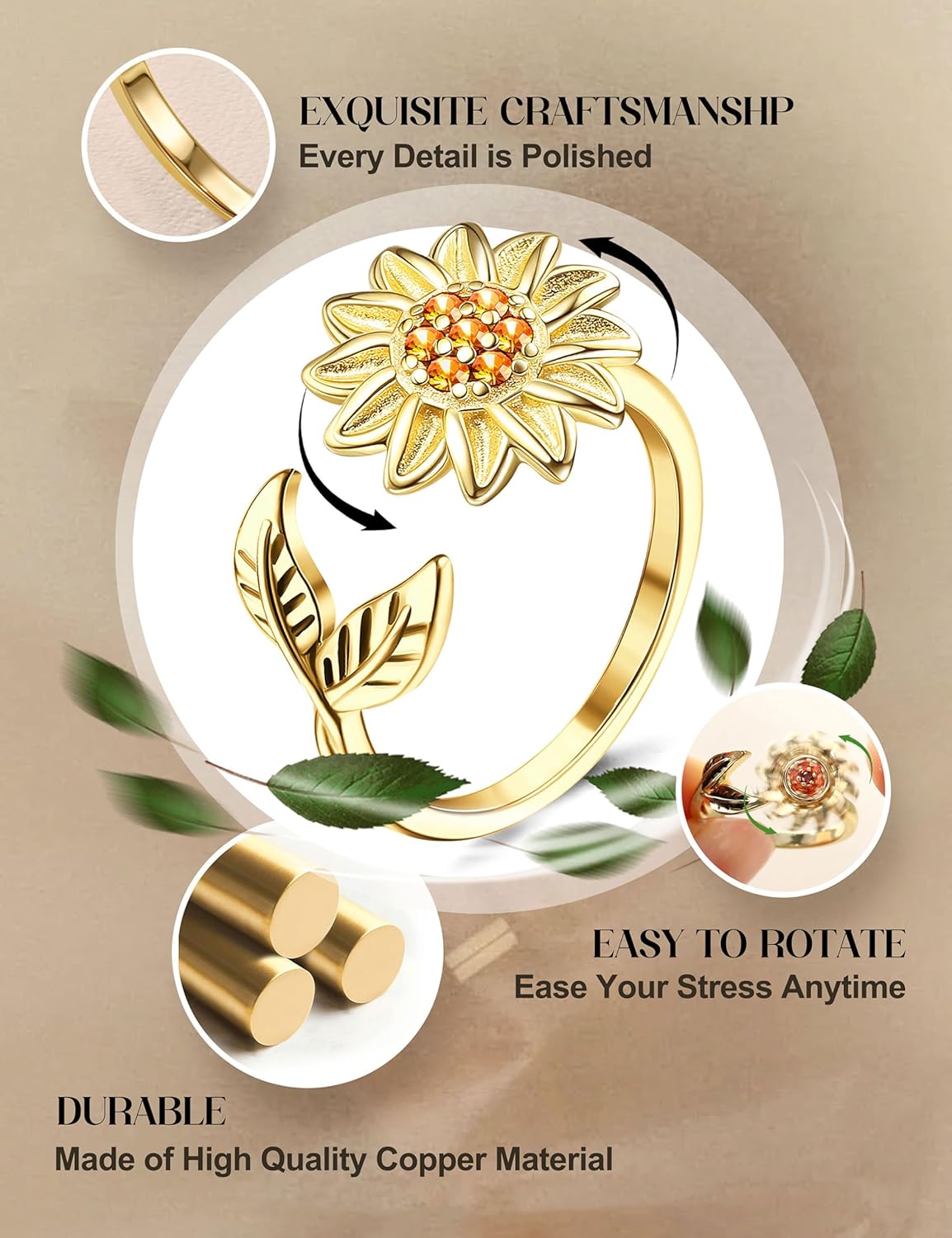 9 styles fidget ring set with dazzling details: You’ll get 9 unique adjustable fidget ring styles: Sunflower, cubic zirconia (cz), butterfly, evil eye, moon star, and bead designs—covering popular fidget ring color and motif trends. Crafted with high-quality brass (500+ friction tests, no fading/rusting) and inlaid with aaa+ cz stones, these fibo steel fidget rings are lightweight yet durable, adding a sparkling touch to daily outfits