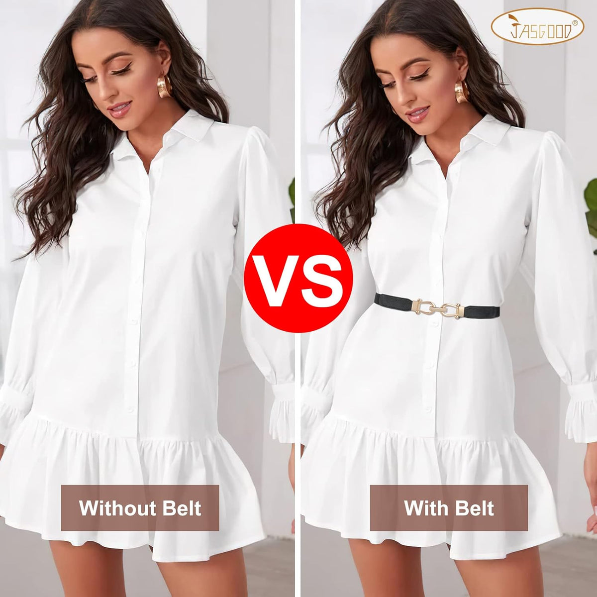 Gold Metal Buckle--- Interlocking metal buckle,easy to wear or take off. The belt back sliding feature make the distinctive adjustable design. Golden color makes this belt stylish, elegant for women dresses, sweater and shirt.