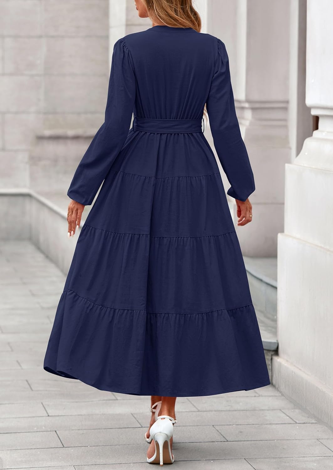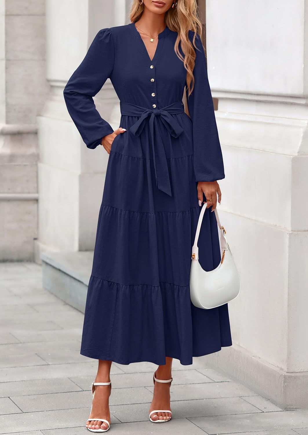 Chic Features: Maxi dresses for women features v neck design with button down details, blending modesty and elegance. Women's long sleeve dress with pockets includes a removable belt to accentuates your waistline for a stylish look
