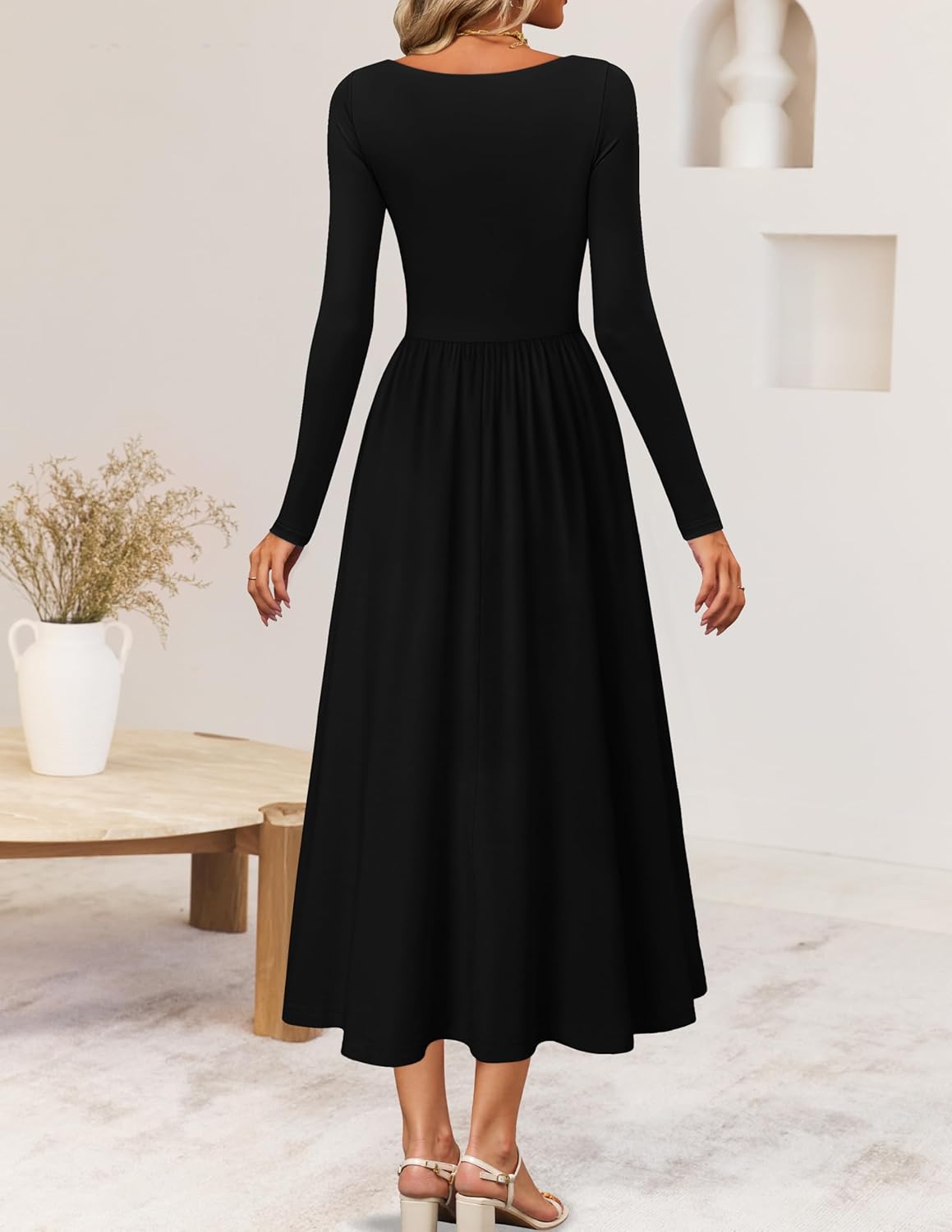 This classic long-sleeve midi dress shines with clean, purposeful design: a square neck frames the collarbone, a V-waist cinches gently, and a fitted top flows into a flared skirt—all in a sleek solid hue. Slim yet comfortable, it balances structure and softness, letting timeless style speak simply